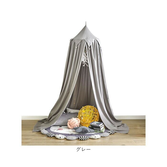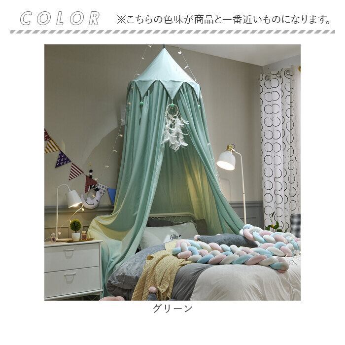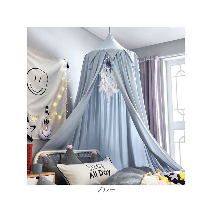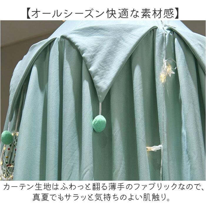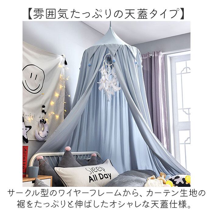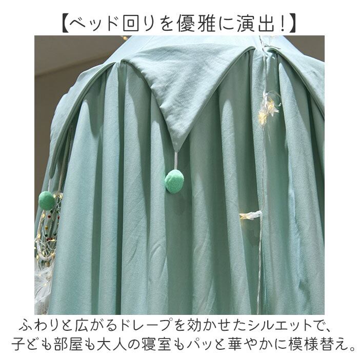 ・サークル型のワイヤーフレームから、カーテン生地の裾をたっぷりと伸ばしたオシャレな天蓋仕様。