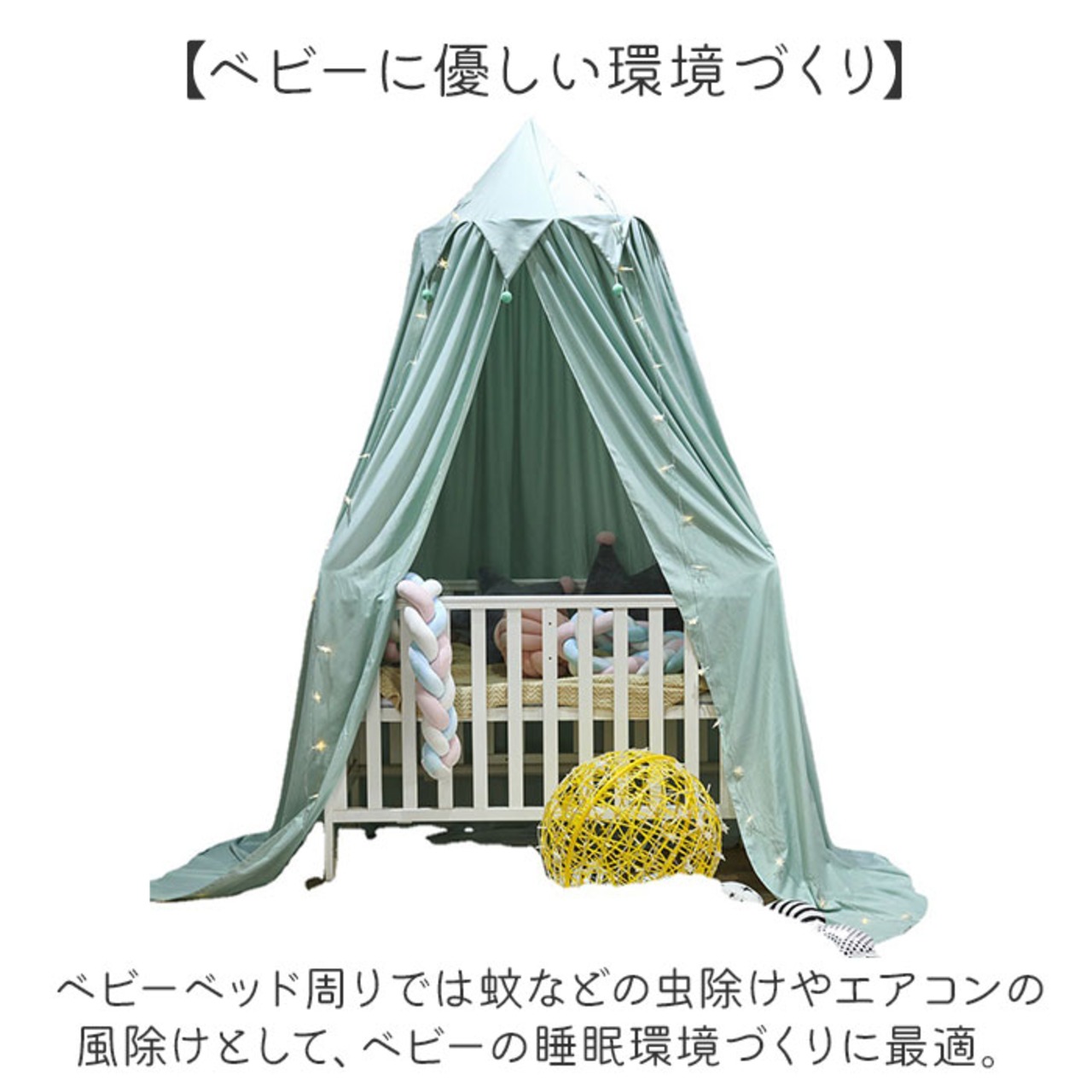 ・ベビーベッド周りでは蚊などの虫除けやエアコンの風除けとして、ベビーの睡眠環境づくりに最適。