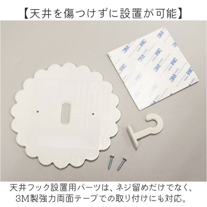 ・天井フック設置用パーツは、ネジ留めだけでなく、3M製強力両面テープでの取り付けにも対応。特別な工具を使用せず、天井の素材に穴あけせずに設置ができるので安心。