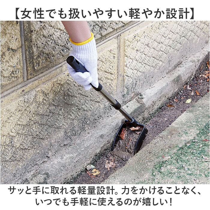 ・側溝に溜まった泥や落ち葉をザザッとすくい上げる!「伸縮ドロ上げシャベル」。