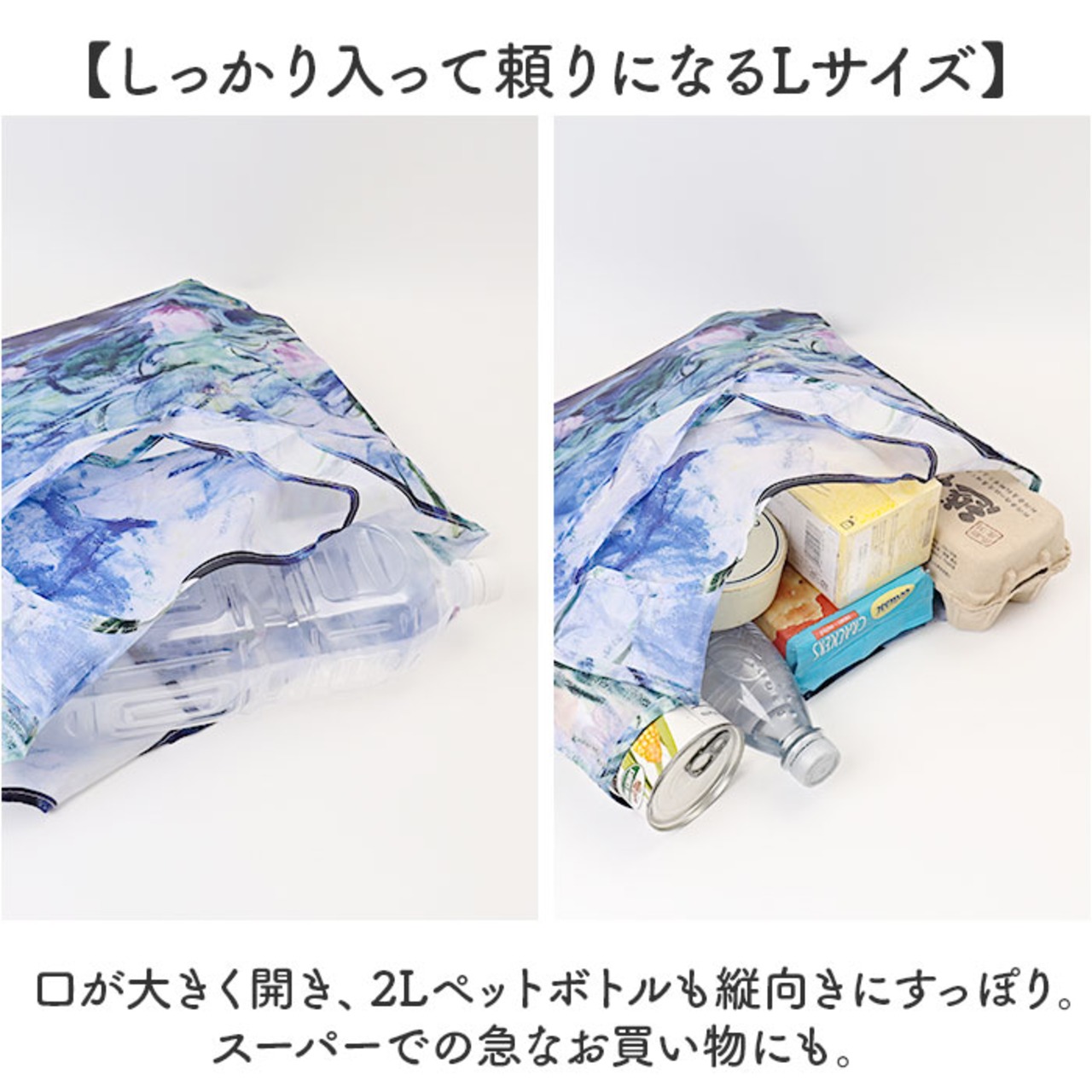 ・口が大きく開き、2Lペットボトルも縦向きにすっぽり。スーパーでの急なお買い物にも。