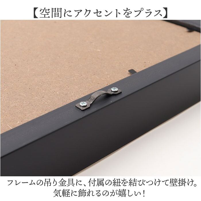 ・フレームの吊り金具に、付属の紐を結びつけて壁掛け。気軽に飾れるのが嬉しい!