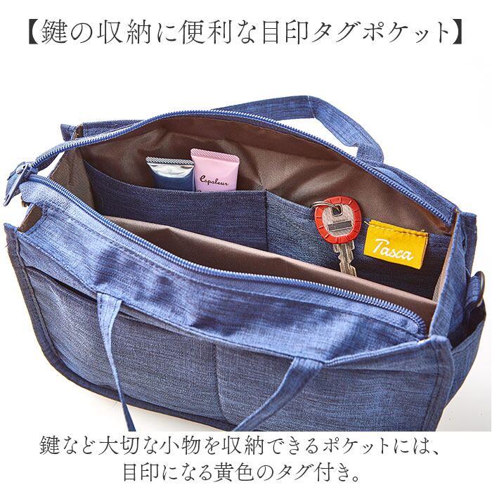 ・鍵など大切な小物を収納できるポケットには、目印になる黄色のタグ付き。