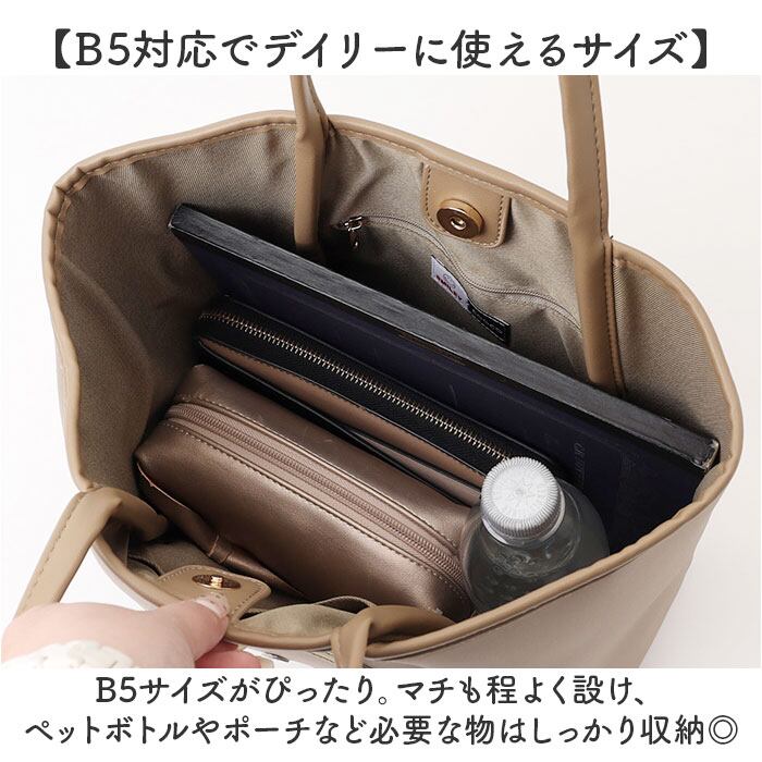 ・B5サイズがぴったり。マチも程よく設け、ペットボトルやポーチなど必要な物はしっかり収納◎