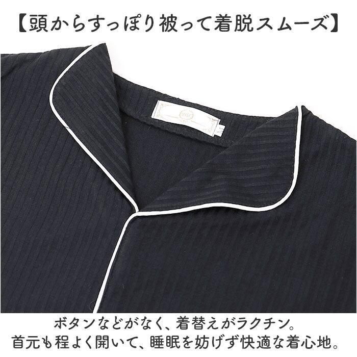 ・ボタンなどがなく、着替えがラクチン。首元も程よく開いて、睡眠を妨げず快適な着心地。