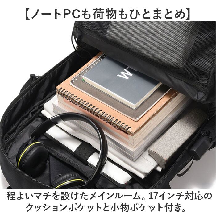 ・程よいマチを設けたメインルーム。17インチ対応のクッションポケットと小物ポケット付き。