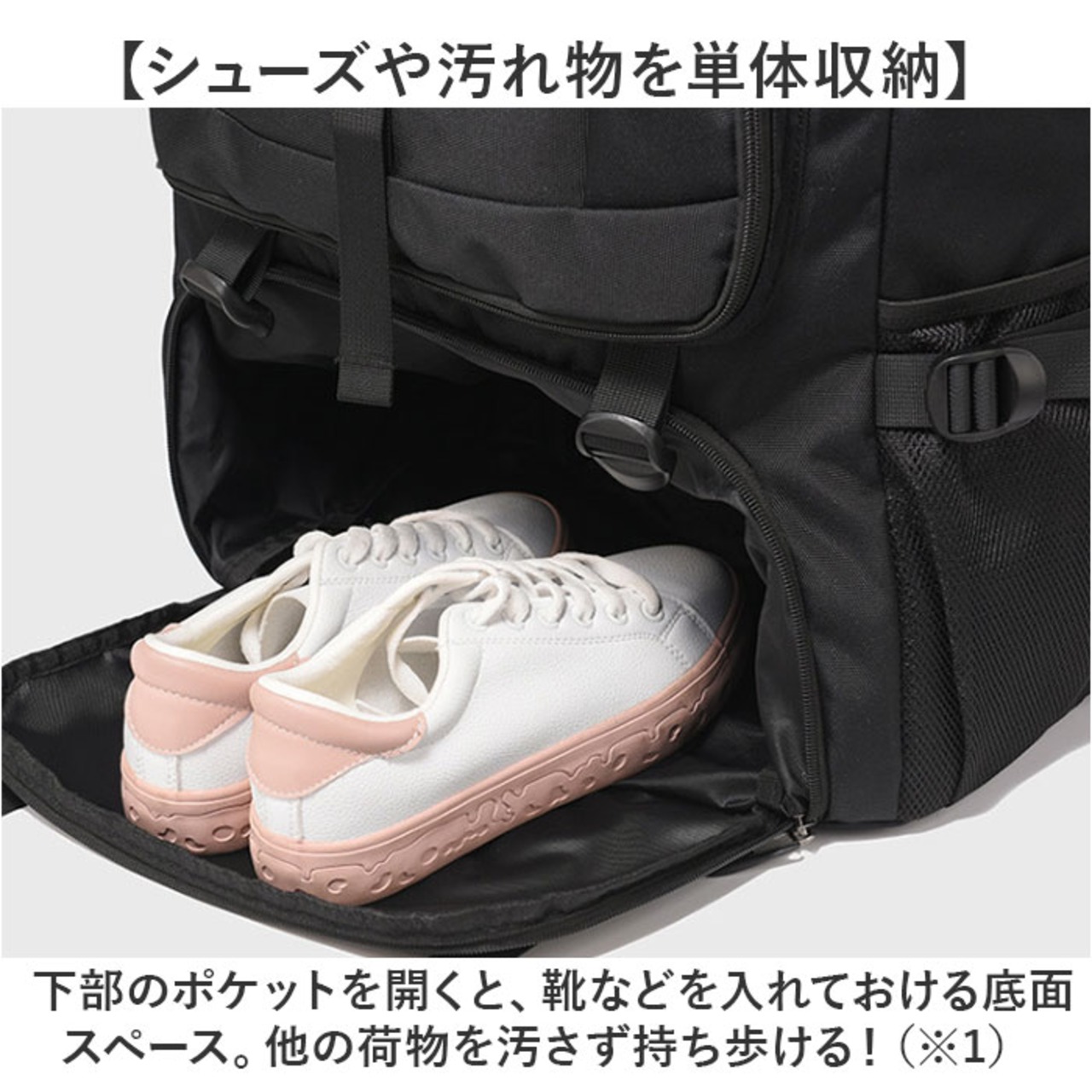 ・下部のポケットを開くと、靴などを入れておける底面スペース。他の荷物を汚さず持ち歩ける!