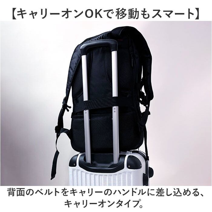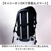 ・背面のベルトをキャリーのハンドルに差し込める、キャリーオンタイプ。