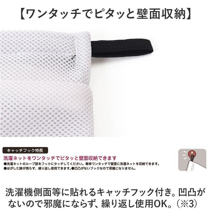 ・洗濯機側面等に貼れるキャッチフック付き。凹凸がないので邪魔にならず、繰り返し使用OK。