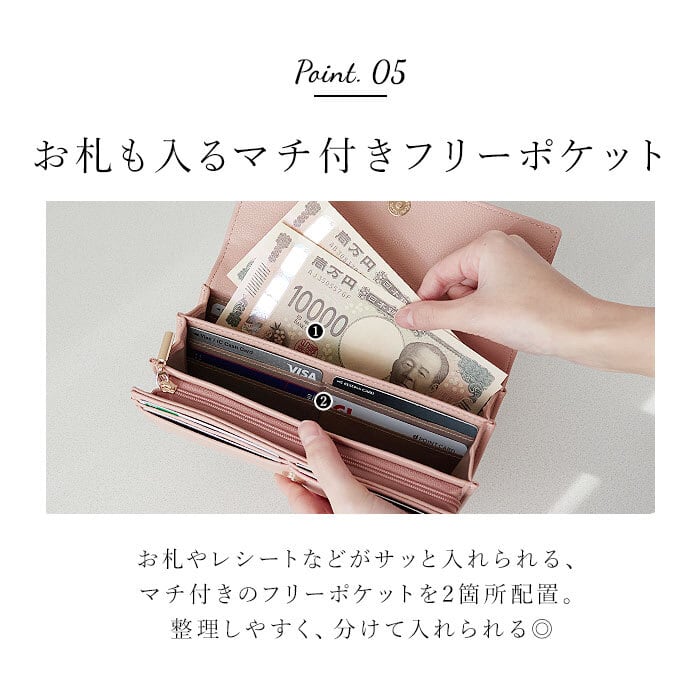 ・3つのフリーポケットを装備。お札やレシート、チケットなどもキレイに分けられる◎