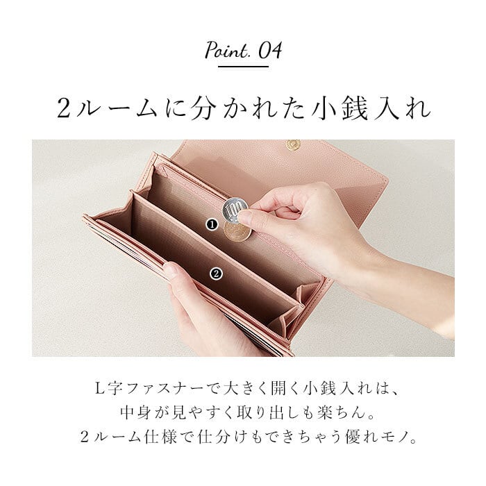・内側:L字ファスナー式小銭入れ×1(内側2スペース仕様)、フリーポケット×3、カードポケット×10~12