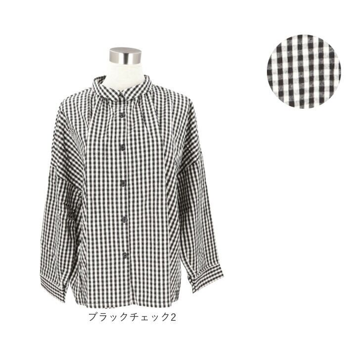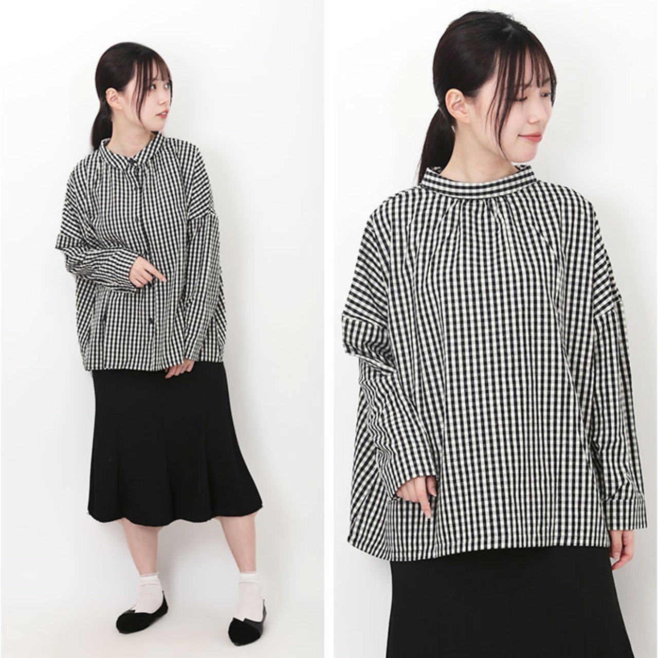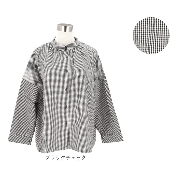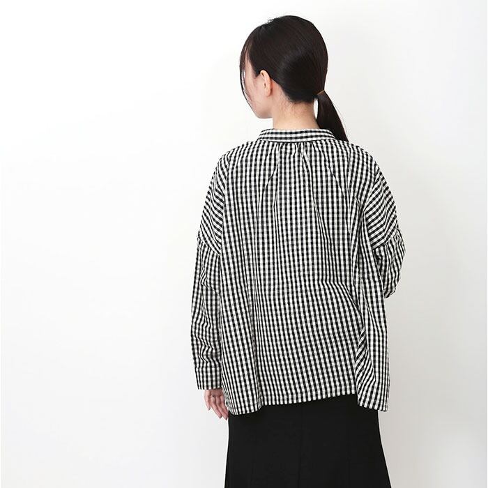 ・フロントは台襟付きのレギュラーカラー。バックはロールネックに襟元ギャザーをプラス。