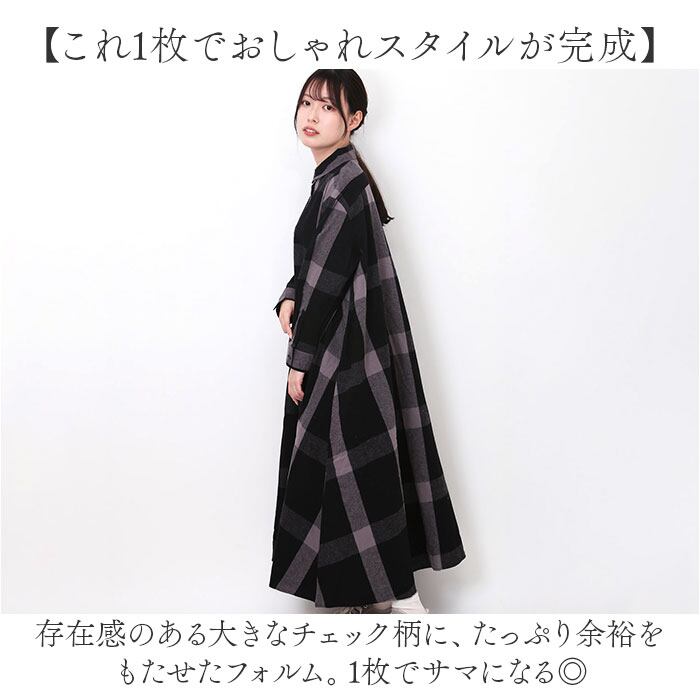 ・存在感のある大きなチェック柄に、たっぷり余裕をもたせたフォルム。1枚でサマになる◎