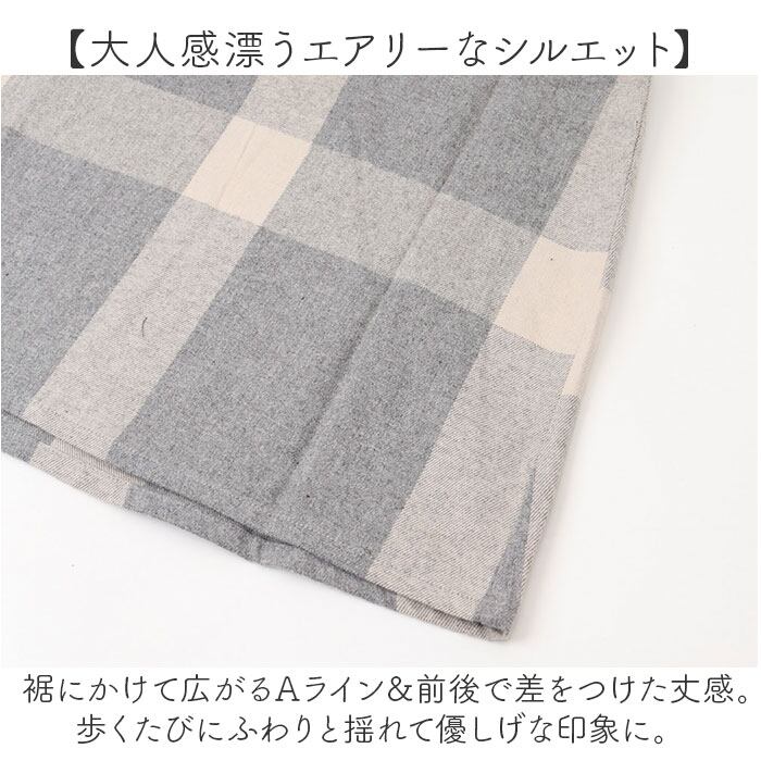 ・裾にかけて広がるAライン&前後で差をつけた丈感。歩くたびにふわりと揺れて優しげな印象に。