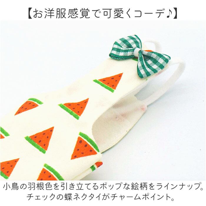 ・小鳥の羽根色を引き立てるポップな絵柄をラインナップ。チェックの蝶ネクタイがチャームポイント。
