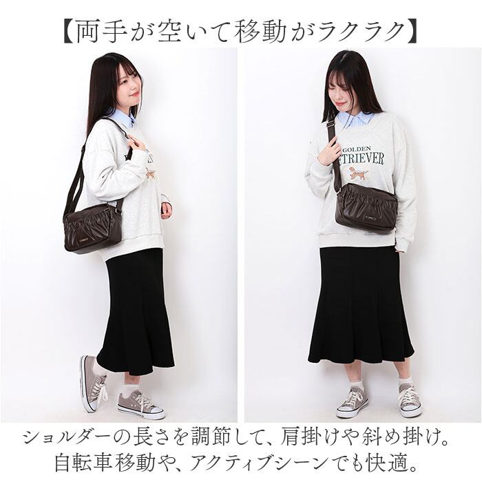 ・ショルダーの長さを調節して、肩掛けや斜め掛け。自転車移動や、アクティブシーンでも快適。