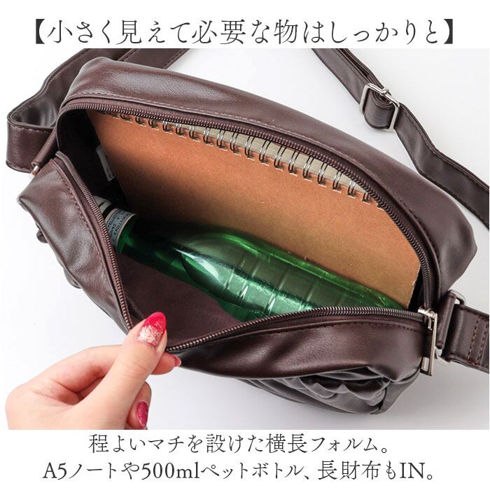 ・程よいマチを設けた横長フォルム。A5ノートや500mlペットボトル、長財布もIN。