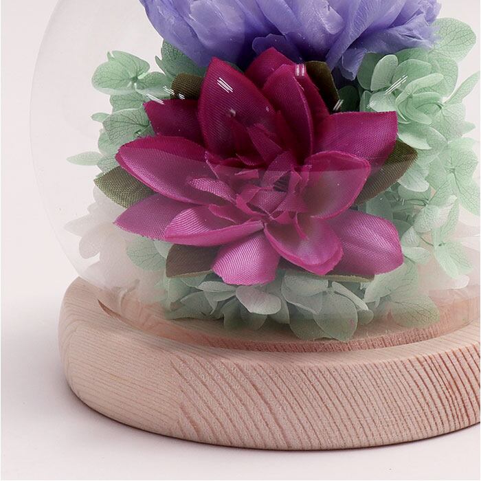・色彩豊かなプリザーブドフラワーをガラス球体に閉じ込めた「お供え ガラスドーム 四季と暦」
