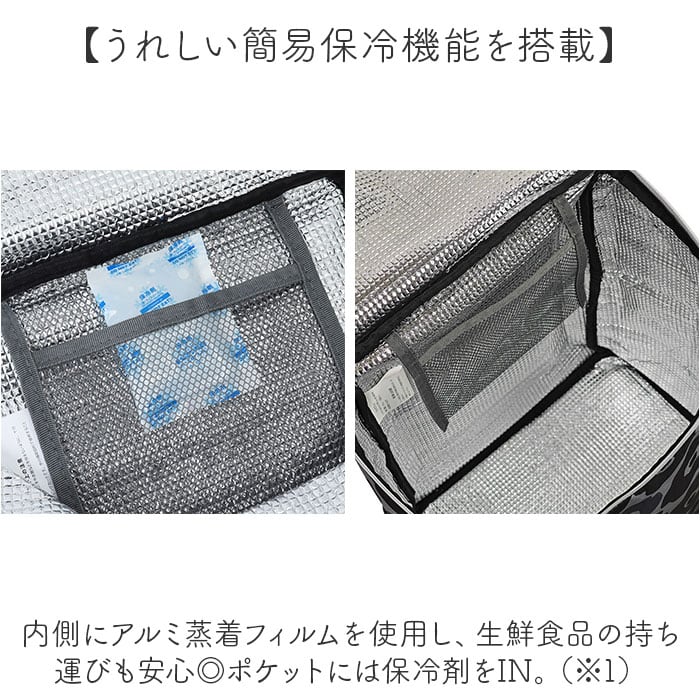 ・内側にアルミ蒸着フィルムを使用し、生鮮食品の持ち運びも安心◎ポケットには保冷剤をIN。