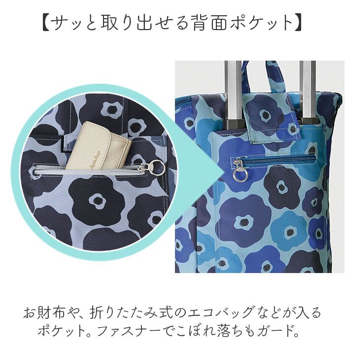 ・お財布や、折りたたみ式のエコバッグなどが入るポケット。ファスナーでこぼれ落ちもガード。