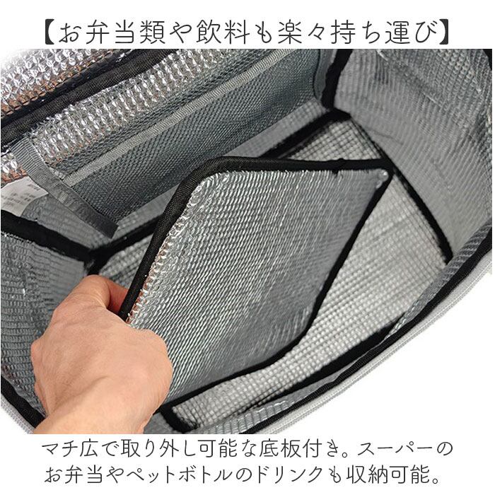 ・マチ広で取り外し可能な底板付き。スーパーのお弁当やペットボトルのドリンクも収納可能。