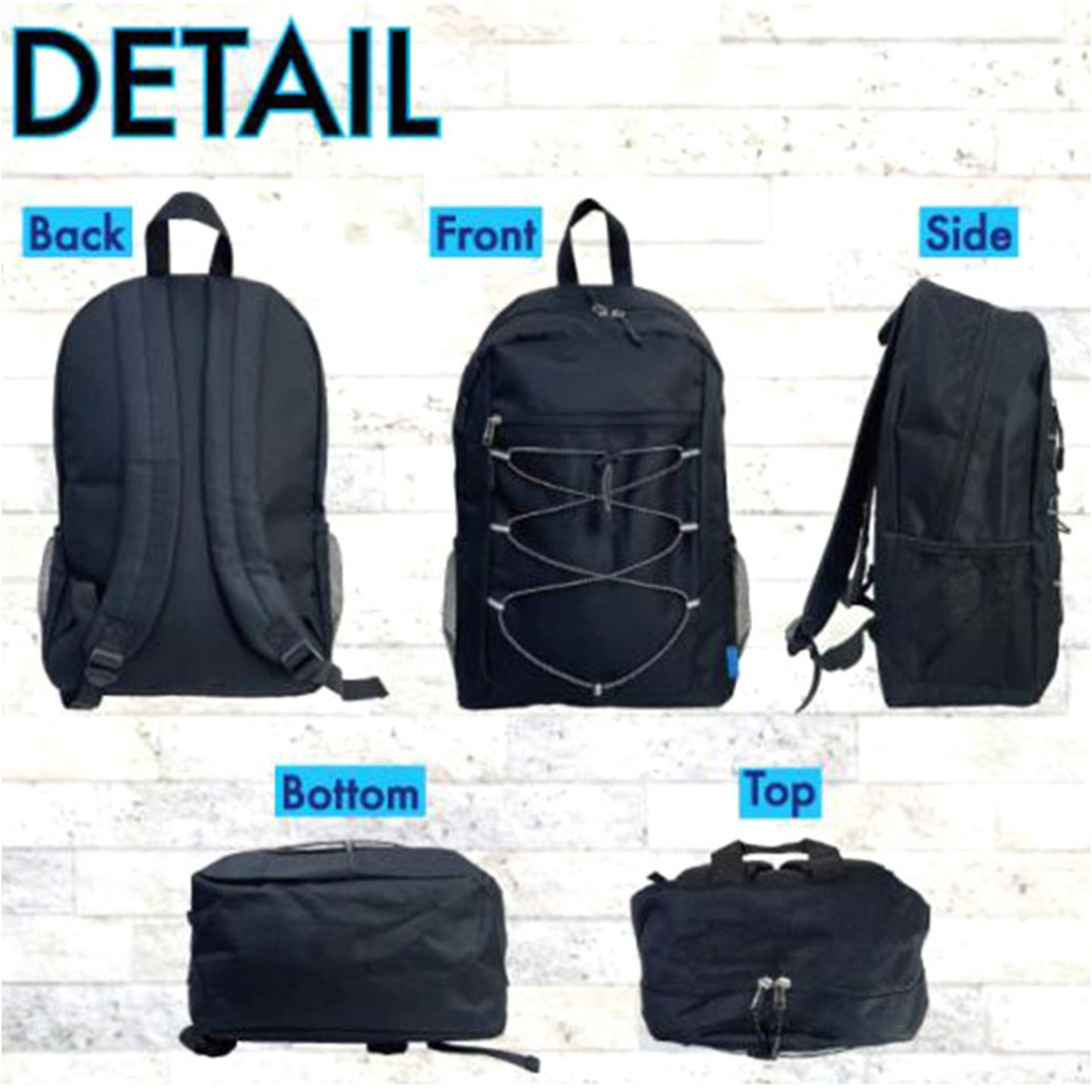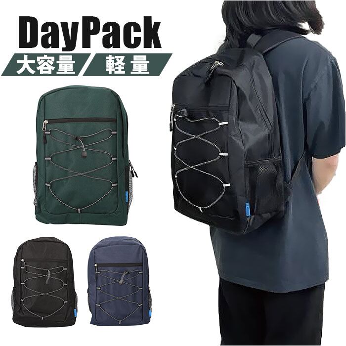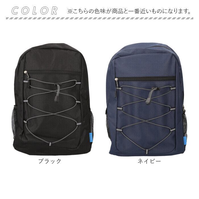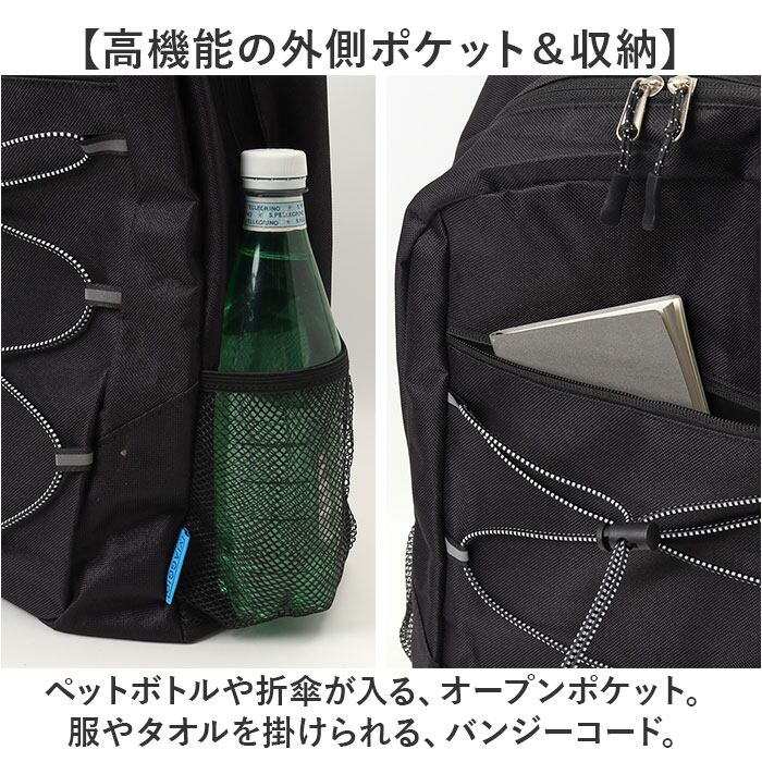 ・ペットボトルや折傘が入る、オープンポケット。服やタオルを掛けられる、バンジーコード。