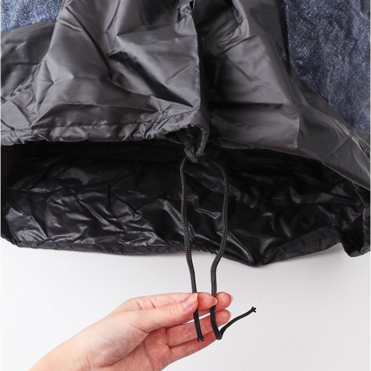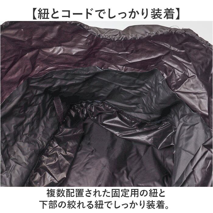 ・複数配置された固定用の紐と下部の絞れる紐でしっかり装着。