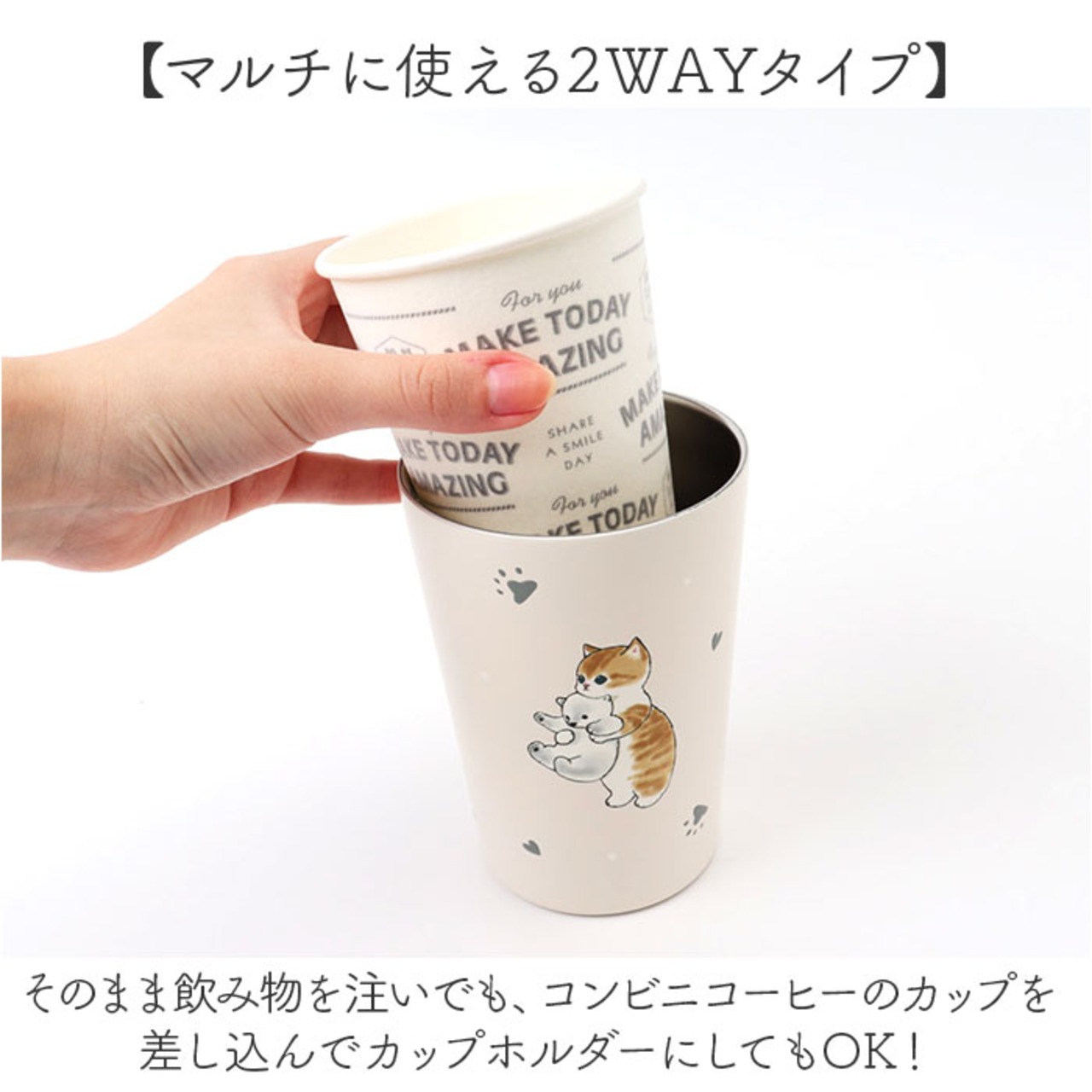 ・そのまま飲み物を注いでも、コンビニコーヒーのカップを差し込んでカップホルダーにしてもOK!