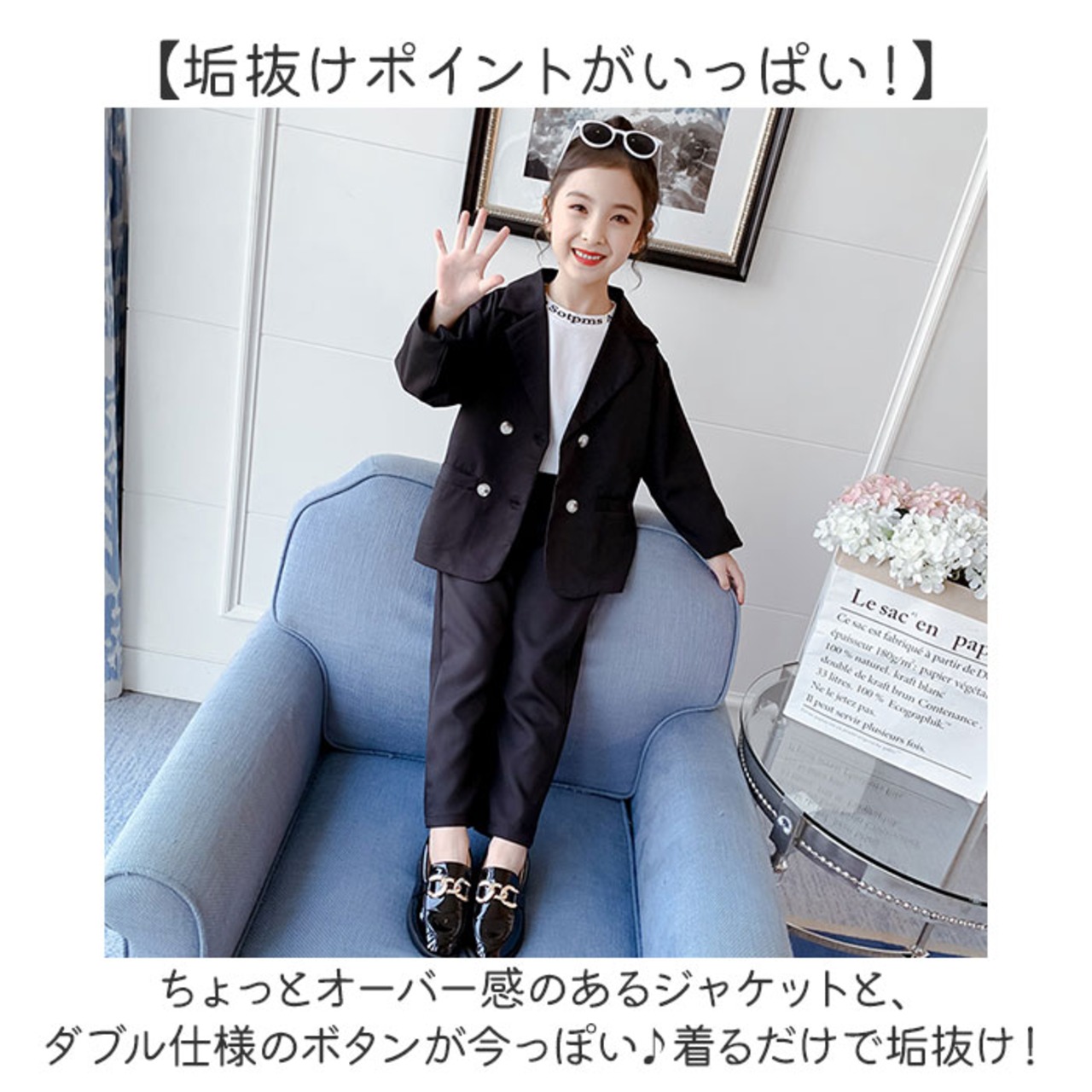 ・ちょっとオーバー感のあるジャケットと、ダブル仕様のボタンが今っぽい♪着るだけで垢抜け!