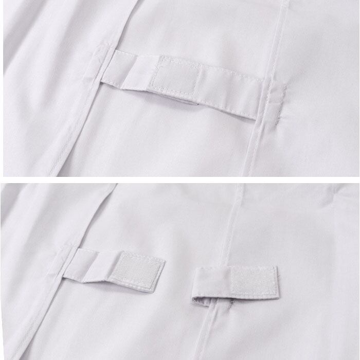 ・首の後ろは伸縮性のあるゴム仕様。頭から被って、腰の面ファスナーを留めるだけ。