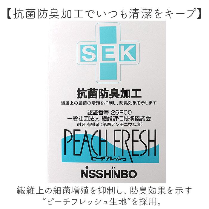 ・繊維上の細菌増殖を抑制し、防臭効果を示す”ピーチフレッシュ生地”を採用。