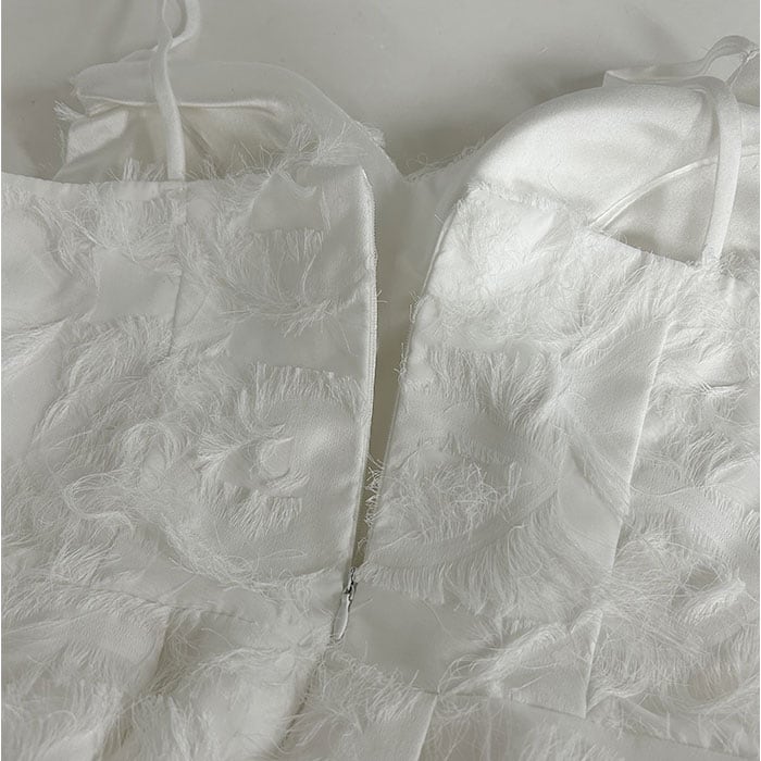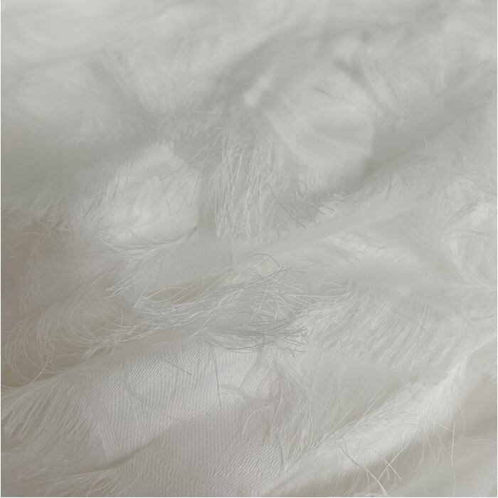 ・華やかなフェザーデザインを大胆に装飾。今っぽさと柔らかな印象で、大人の着こなしを叶える