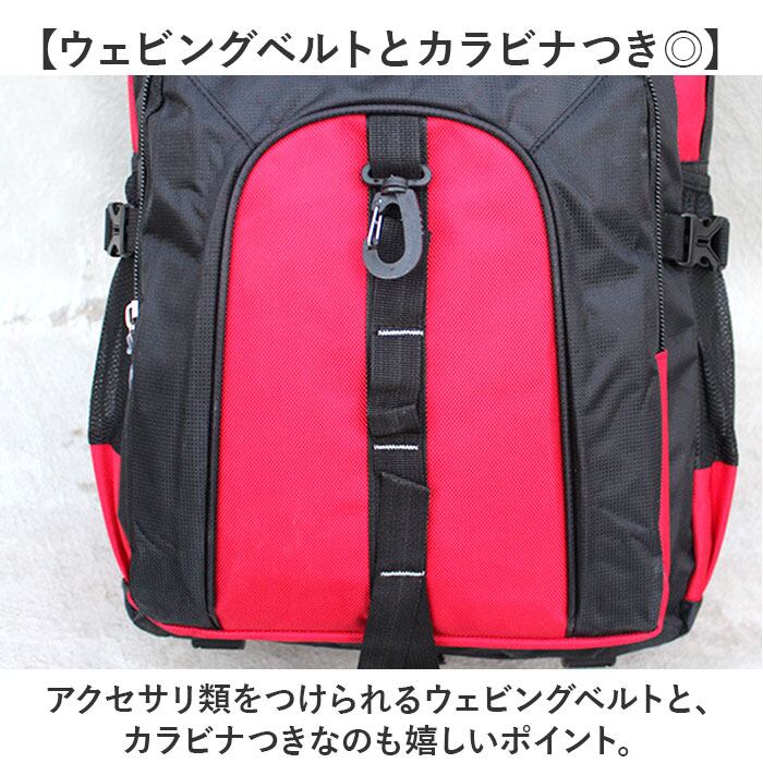 ・アクセサリ類をつけられるウェビングベルトと、カラビナつきなのも嬉しいポイント。