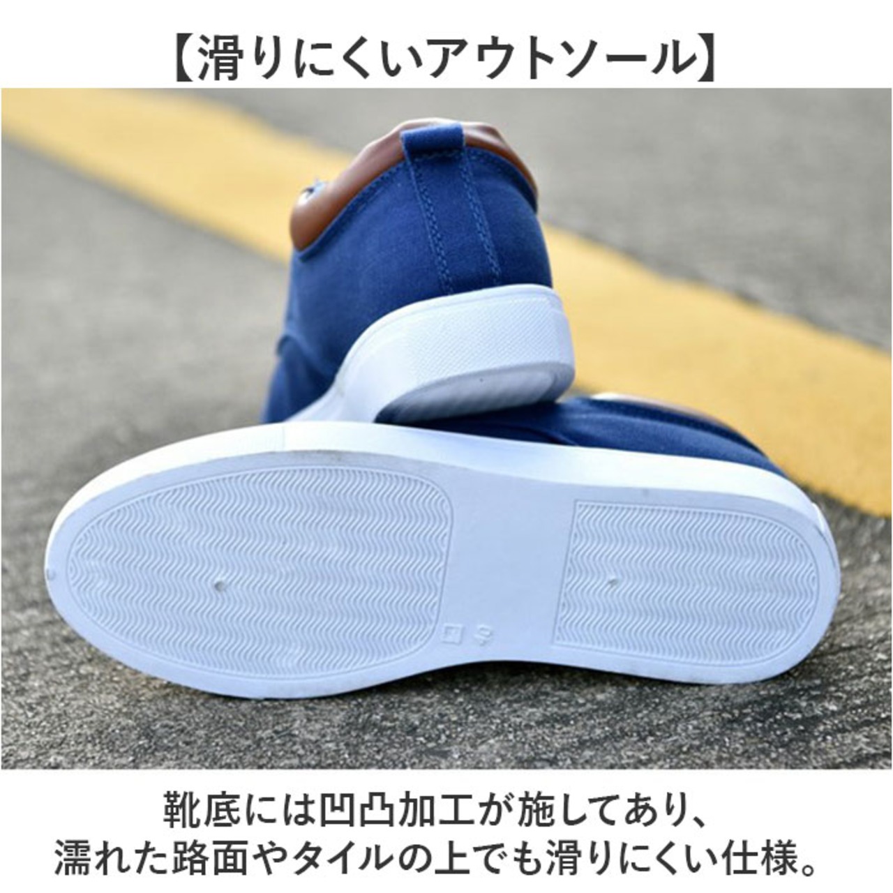 ・靴底には凹凸加工が施してあり、濡れた路面やタイルの上でも滑りにくい仕様。