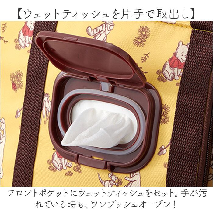 ・フロントポケットにウェットティッシュをセット。手が汚れている時も、ワンプッシュオープン!