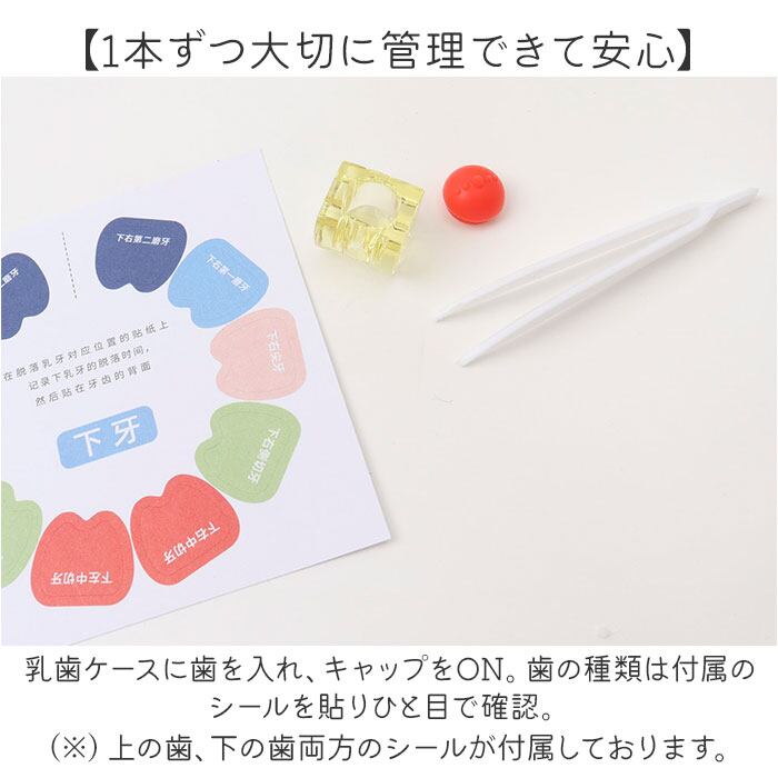 ・乳歯ケースに歯を入れ、キャップをON。歯の種類は付属のシールを貼りひと目で確認。