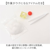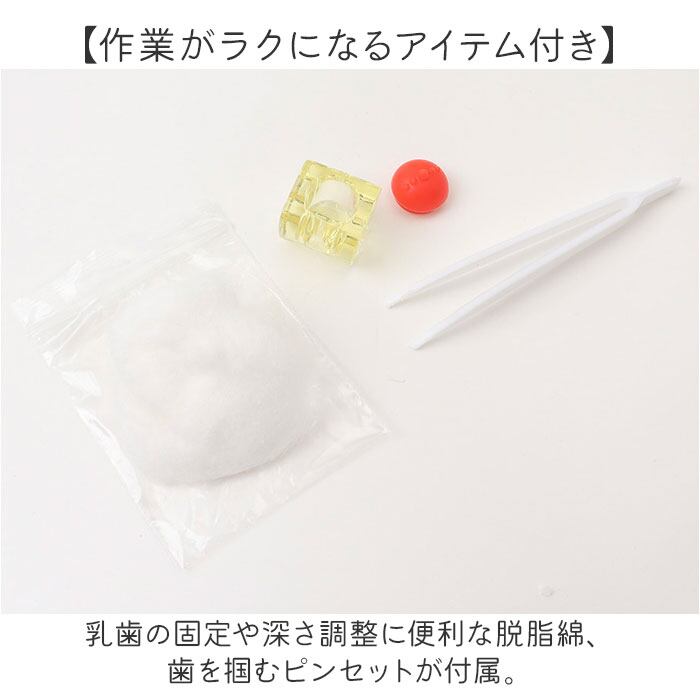 ・乳歯の固定や深さ調整に便利な脱脂綿、歯を掴むピンセットが付属。