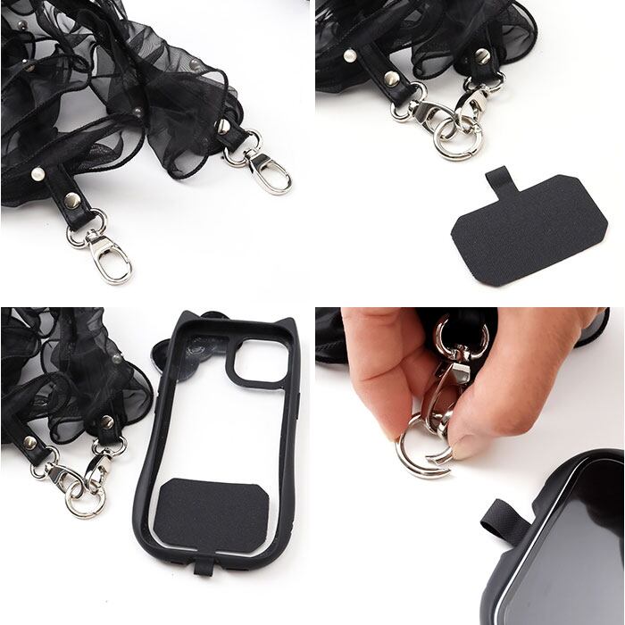 ・スマホとケースの間に挟む、ストラップシート付き。ストラップもナスカンでワンタッチ。