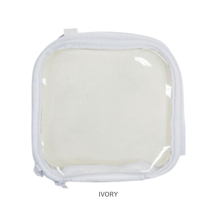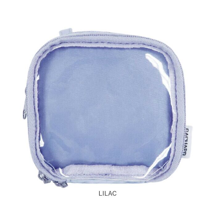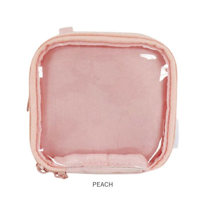 ・中身が見えるクリア仕様のポケットには、チャームなどを。ダブルファスナーで大きく開閉。