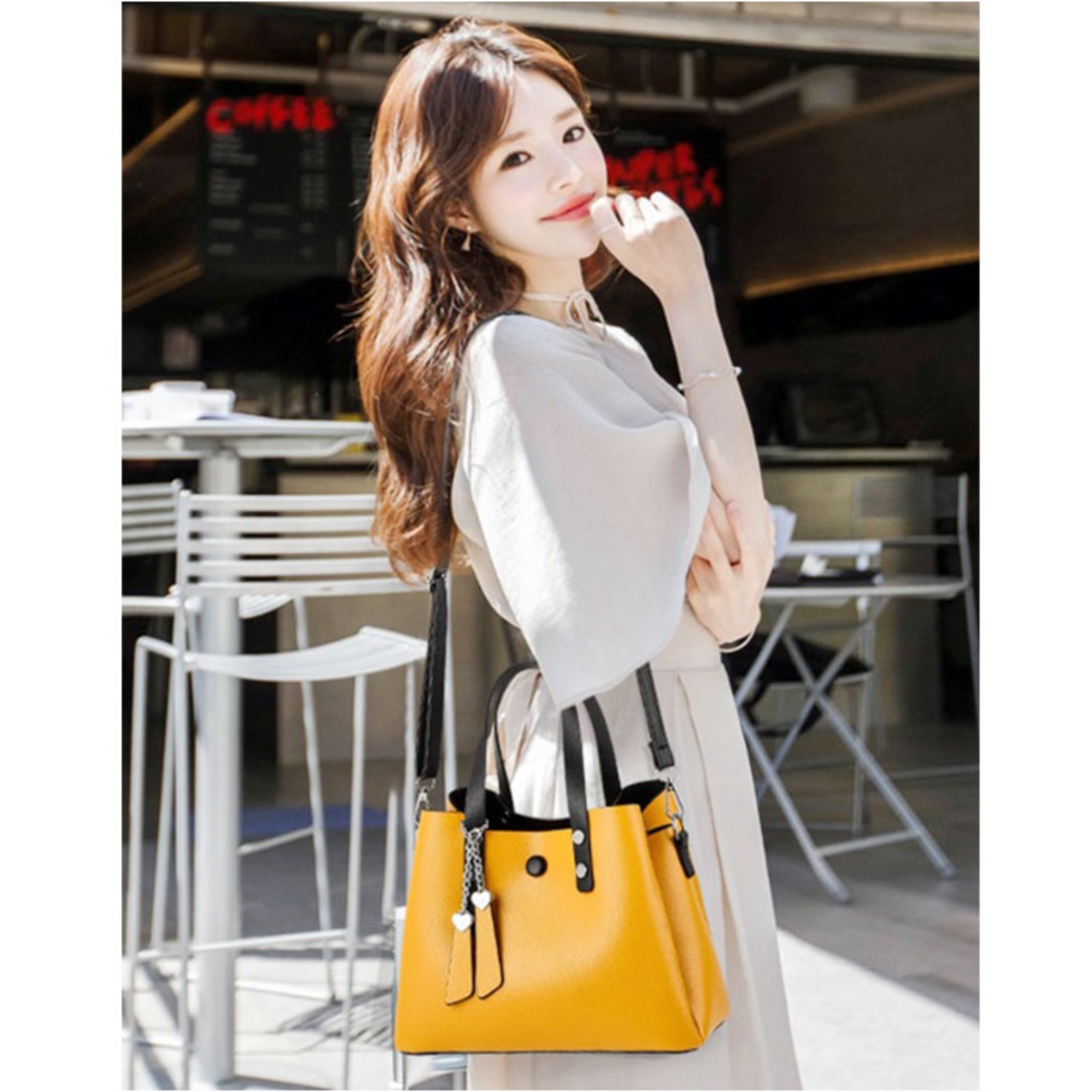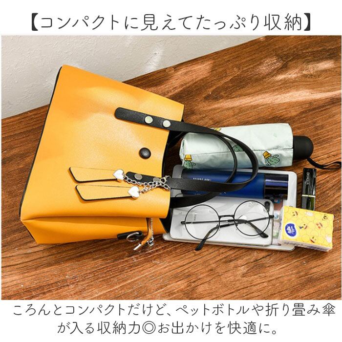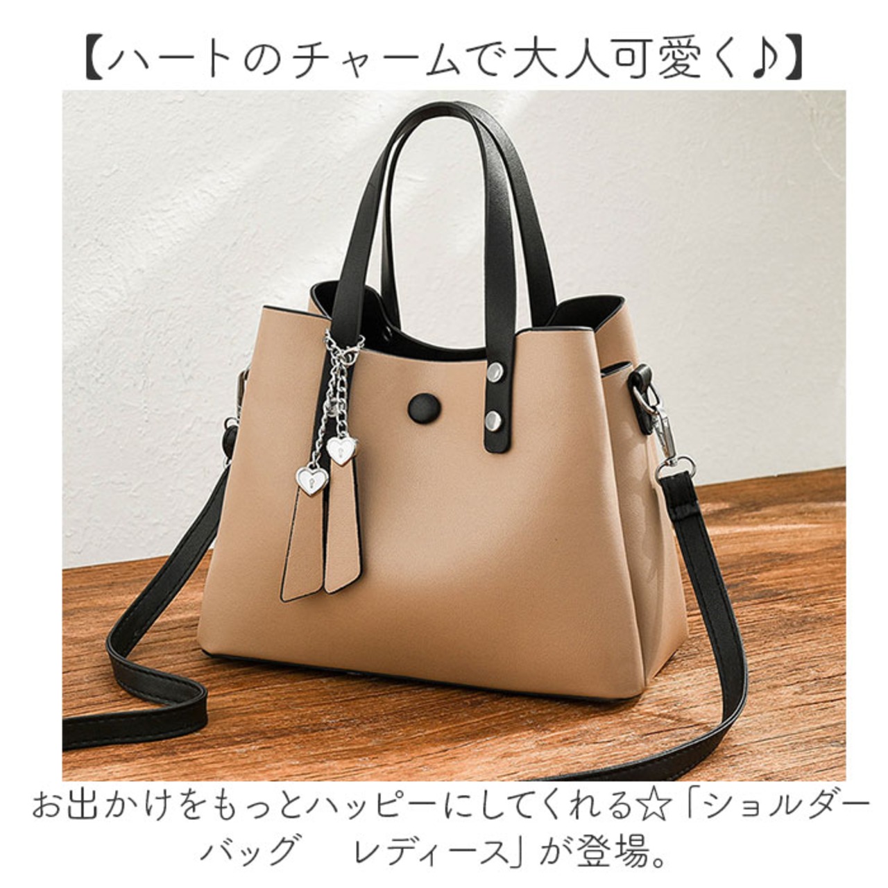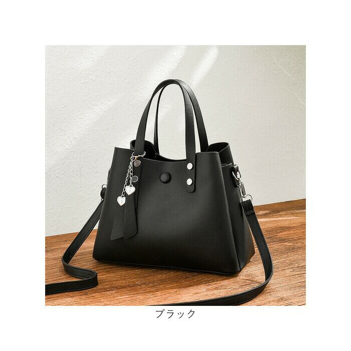 ・落ち着きのあるレザー調の生地の大人バッグに、ハートのチャームでキュートさをプラス!