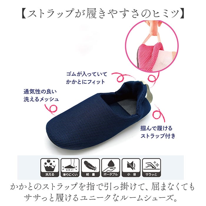 ・かかとのストラップを指で引っ掛けて、屈まなくてもササっと履けるユニークなルームシューズ。