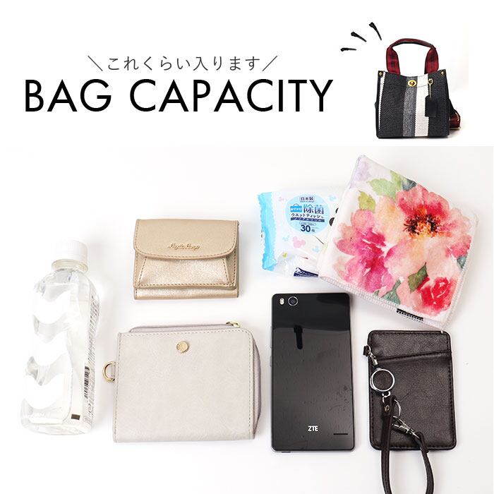・二つ折り財布や350mlペットボトル、ミニポーチ等をIN。身軽にお出かけできるサイズ感。