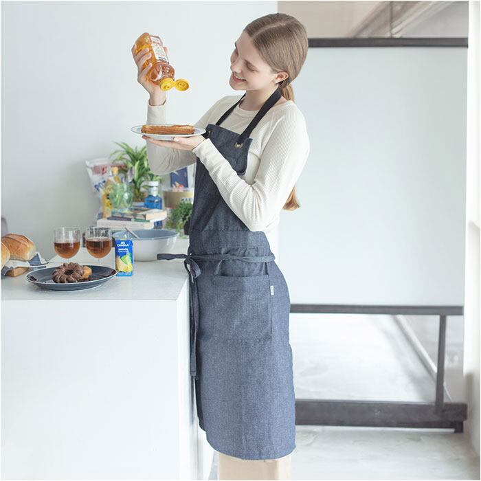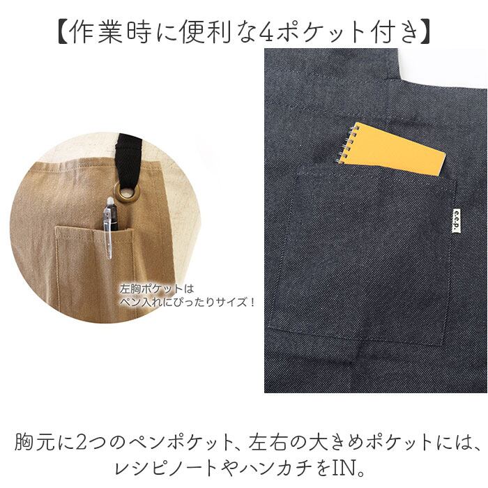 ・胸元に2つのペンポケット、左右の大きめポケットには、レシピノートやハンカチをIN。