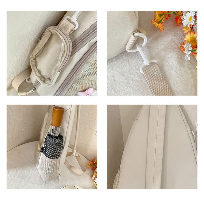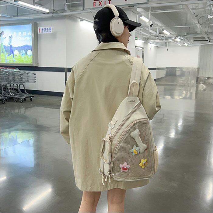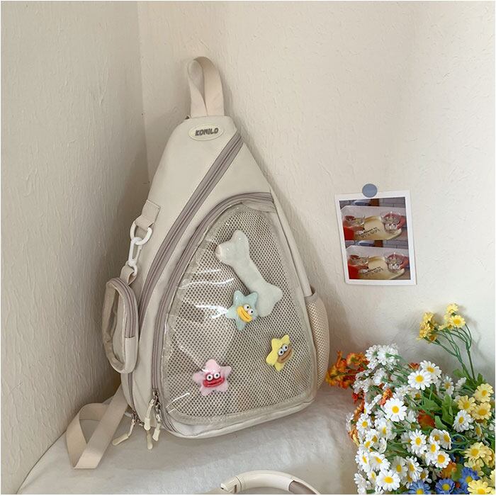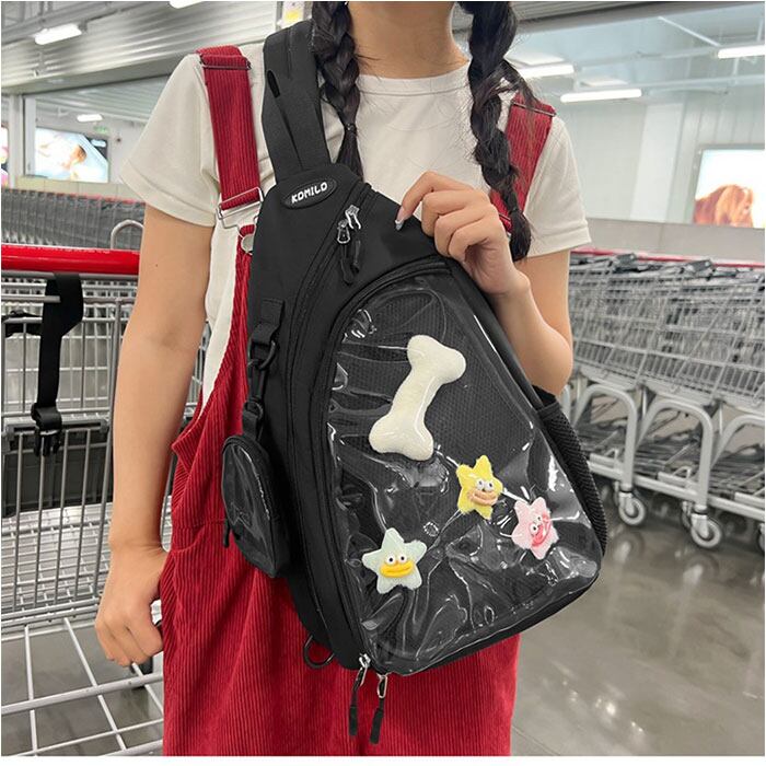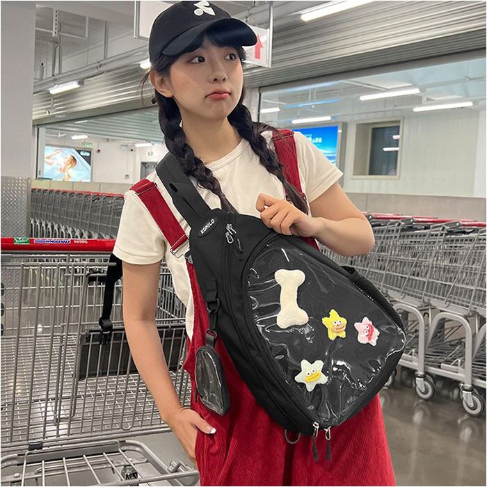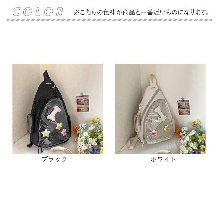 ・バッグの前面は大きなクリア窓。バッジやピンを挿せるデコ板つき◎自由にデコレーション!