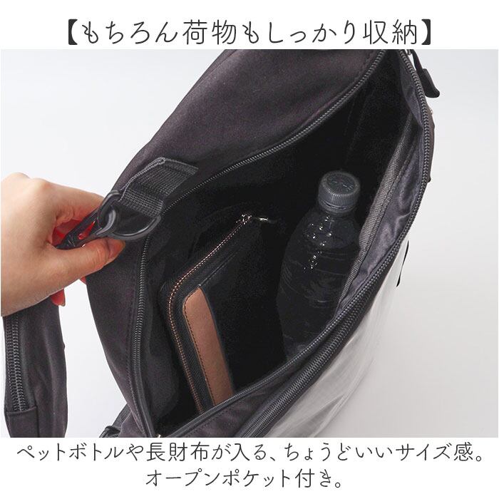 ・ペットボトルや長財布が入る、ちょうどいいサイズ感。オープンポケット付き。