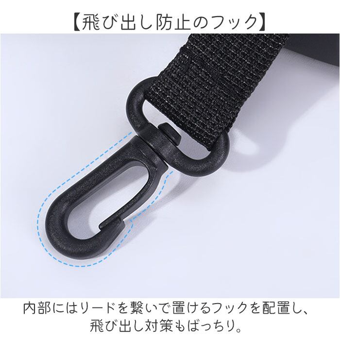 ・内部にはリードを繋いで置けるフックを配置し、飛び出し対策もばっちり。
