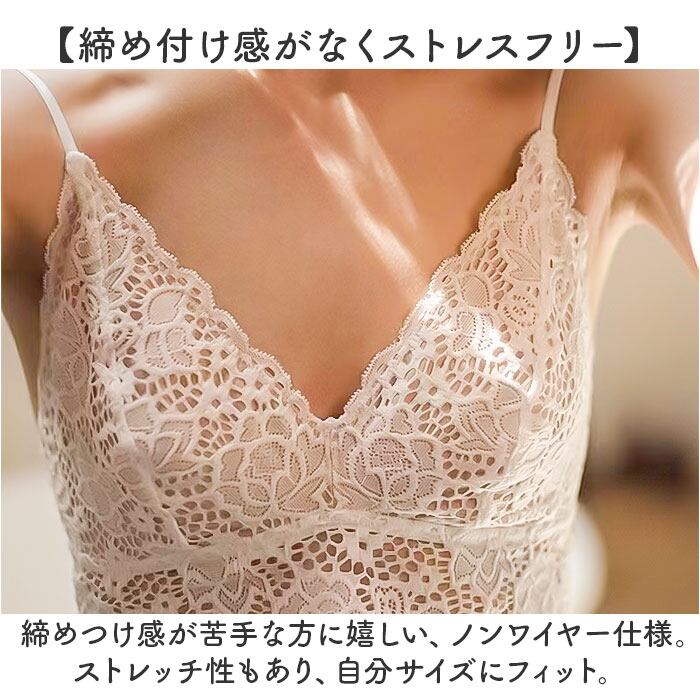 ・締めつけ感が苦手な方に嬉しい、ノンワイヤー仕様。ストレッチ性もあり、自分サイズにフィット。