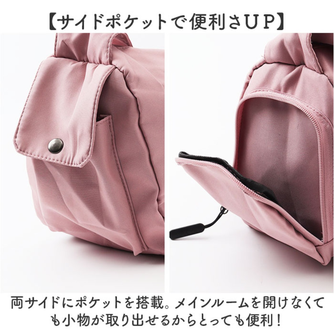 ・両サイドにポケットを搭載。メインルームを開けなくても小物が取り出せるからとっても便利!