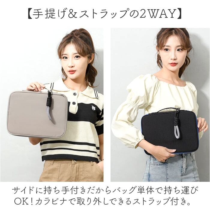 ・サイドに持ち手付きだからバッグ単体で持ち運びOK!カラビナで取り外しできるストラップ付き。