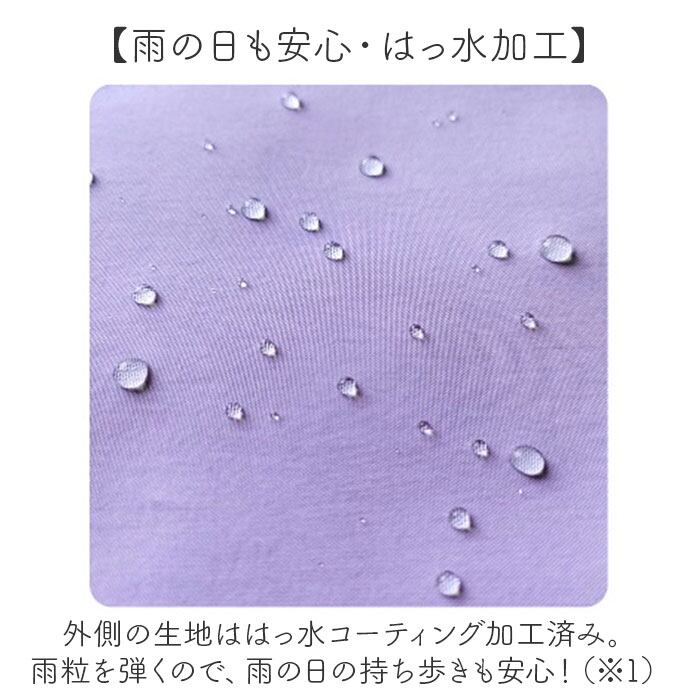 ・外側の生地ははっ水コーティング加工済み。雨粒を弾くので、雨の日の持ち歩きも安心!